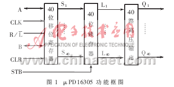 μPD16305的功能结构可分为三部分:40位双向移位寄存器、40位锁存器和高压输出功能块。它除了有40路的高压输出以外,还有一个低压的输入和一个低压的输出。并且这两个输入输出端口都是双向的,当一个为输入时,另一个为输出,其输出是移位寄存器输出的最后一位。将此输出与另一片μPD16305的输入相连,可以级联驱动40路以上的显示器。对于分辨率为852×480的PDP来说,只需12片μPD16305就可以了。图1示出了μPD16305的主要功能块。