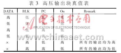 移位寄存器、锁存器和高压输出块的真值表分别如表1、2、3所示。
