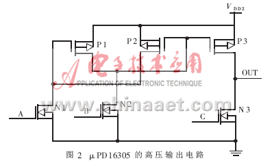 在这三部分电路中,高压输出驱动电路部分是μPD16305芯片的核心部分,它为负载提供了高电压、大电流的输出,高压输出直接驱动PDP屏的显示单元,点亮被选中的象素。图2为μPD16305高压输出驱动电路图。