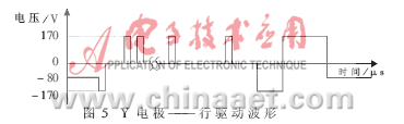 在维持期里,所有Y电极的波形完全一致。但在寻址期中扫描寻址时,各行的Y电极有效时间不同,出现有多种电压。所以在维持期和寻址期,可以通过MOS开关管的不同状态,使驱动芯片的电源脚和地脚在不同时刻与不同电压相接,以得到所需要的波形。这种连接方式降低了输出级MOS管上的电压,应用起来有很大的余地。