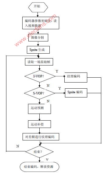 现在,基于MPEG-4 标准的应用大多为硬件方案,采用专门的MPEG-4 编码芯片,难以实现升级,灵活性也较差,而本文中使用软件方案,可按实际应用要求进行编码,易于以后的升级,具有很好的灵活性。本文中,实现的是自然视频编码,不涉及音频编码。软件设计的总体步骤是首先利用图像分割技术生VOP,接下来是Sprite 生成,最后是对各VOP 的编码。软件实现流程如图1 所示。下面对其中的关键技术作介绍,重点是以前的标准中所没有的:视频对象平面VOP(video object plane)的定义与生成,Sprite 生成与编码,形状、运动、纹理编码,可扩展编码。MPEG-4 中,VOP 分四种,I-VOP、P-VOP、B-VOP、S-VOP,对于普通视频对象,只涉及到前三种,S-VOP 指SpriteVOP。