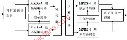 当用于空域扩展时,可扩展预处理器对输入的VOP 下采样,得到由VOP编码器处理的基本层VOP。中间处理器处理重建的基本层VOP,并对其进行上采样,原始VOP 与中间处理器输出的差作为增强层编码器的输入。在增强层中的编码是以P-VOP 或B-VOP 方式编码的。通过反复接器可以分别访问基本层和增强层解码器对应的基本层和增强层码流,解码器端的中间处理器与编码端执行相同的操作,扩展后处理器执行必要的转换工作。