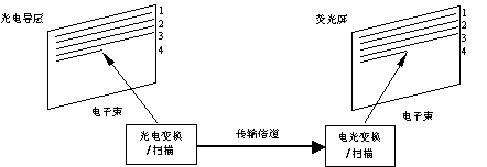 利用人眼的视觉惰性,在发送端可以将代表图像中像素的物理量按一定顺序一个一个地传送,而在接收端再按同样的规律重显原图像。只要这种顺序进行的足够快,人眼就会感觉图像上在同时发亮。在电视技术中,将这种传送图像的既定规律称为扫描。如图07-02-5所示,摄像管光电导层中形成的电图像在电子束的扫描下顺序地接通每一个点,并连续地把它们的亮度变化转换为电信号;扫描得到的电信号经过单一通道传输后,再用电子束扫描具有电光转换特性的荧光屏,从电信号转换成光图像。