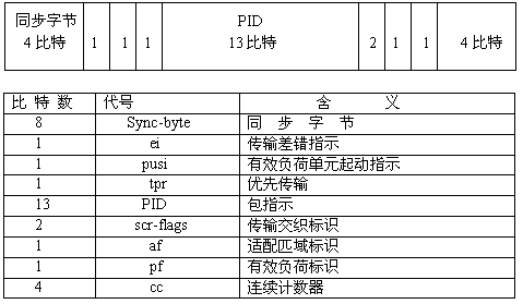 每个传输流的前4个字节为字头(Header),字头后面就是需要传送的有用信息,包括音频,视频或数据信息,通常是 184个字节长度,有时在有用信息(Useful Data)中插入一段适配字段(Adaptation Field),用于补充长度不完整的传输流,放置解码时钟(PCR)。传输流的字头是识别传输流的关键,其结构见图07-05-5,由 32个比特组成,其含义见下图07-05-5。