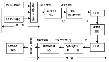 —— 信道编码包括:前向纠错编码、解码、调制、解调和上下变额三部分。前向纠错码根据不同的传输媒介采用不同的组合。卫星传输采用 QPSK调制,有线传输采用QAM调制,地面广播采用 COFDM调制或 I6VSB调制。见图07-05-6。