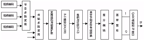 数字有线电视采用与卫星同样的"核",即 MPEG-2压缩编码的传输流。由于传输媒介采用的是同轴线,与卫星传输相比外界干扰小,信号强度相对高些,所以前向纠错码保护中取消了内码。调制方式改成 64-QAM方式,有时也可以采用1 6-QAM,32-QAM或更高的 128-QAM,256-QAM。对于 QAM调制而言,传输信息量越高,抗干扰能力越低。在一个 8MHz标准电视频道内,如果使用 64-QAM,所传输的数据速率为 38.5Mb/s。