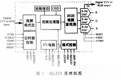 AL251是AVERLogic公司生产的一款功能强大的显示转换控制芯片,主要用于LCD VGA显示或视频编辑应用场合,它能够接收隔行NTSC或PAL,ITU?RBT601(CCIR601)或平方像素,YUV422或RGB565数字信号,将其转换成普通PC显示器可以接收的模拟RGB格式视频信号和用于在VGA LCD上显示的YUV422或RGB565格式的逐行数字视频信号。AL251有多种控制功能,可由微处理器通过IIC接口实现诸如自动识别PAL制/NTSC式、调整屏幕位置、过滤视频噪声、OSD(在屏显示)、视频LUT(Lookup Table)、POWERDOWN等功能,可不需软件控制进行硬初始化。AL251具有AVERLogic特有的数字信号处理技术,处理过的图像更加平滑、有更少的闪烁和锯齿边沿。该芯片供电电压为3.3V或5V,采用80引脚QFP封装形式。