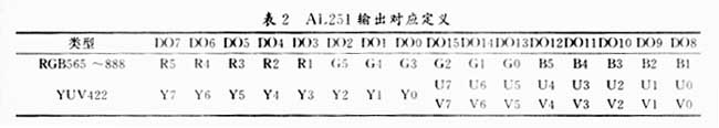 AL251可输入输出两种数据格式:YUV422或RGB565。输入视频格式由引脚INTYPE(1为YUV422,0为RGB565)决定,输入接口见表1;输出视频格式由控制寄存器08h选择,输出接口见表2。AL251的精度依靠之前的视频解码器,不需要软件控制,最高支持1024×768。其VCLK由解码器提供。?