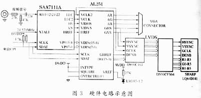 图中, PAL/NTSC/SECAM三种制式视频信号可通过SAA7111A的AI11/AI12/AI21/AI22通道输入,如是S端子则占用两路输入通道,其中AI12接S端子的3脚,AI22接S端子的4脚,S端子的1、2引脚接地,实际的使用端口可通过软件选择进行设置。24.576MHz的基准时钟信号通过XTALI输入; AL251的VCLK,VIDHS,VIDVS,HREF 是输入视频信号的行场同步和采样时钟; SQUARE是平方像素和CCIR601选择设置(1/0),这里选用CCIR方式;OVLCTRL0/1是层叠控制,00是无层叠; GHS,GVS是输出视频信号的行场同步,模/数RGB接口共用这两根引脚;SAA7111A输出的LLC时钟信号直接与液晶屏的GCLK引脚相接,GHREF是液晶屏的显示使能,VREF用于模拟RGB端口(如不使用可悬空)。由于AL251的数据输出口是16位的,而LQ64D341是18位的,这里将R0和B0接地,其余引脚对应关系不变。SDA和SCL是IIC控制接口,各接一个4.7kΩ上拉电阻,SAA7111A的读/写地址是49h/48h,AL251的读/写地址是59h/58h。