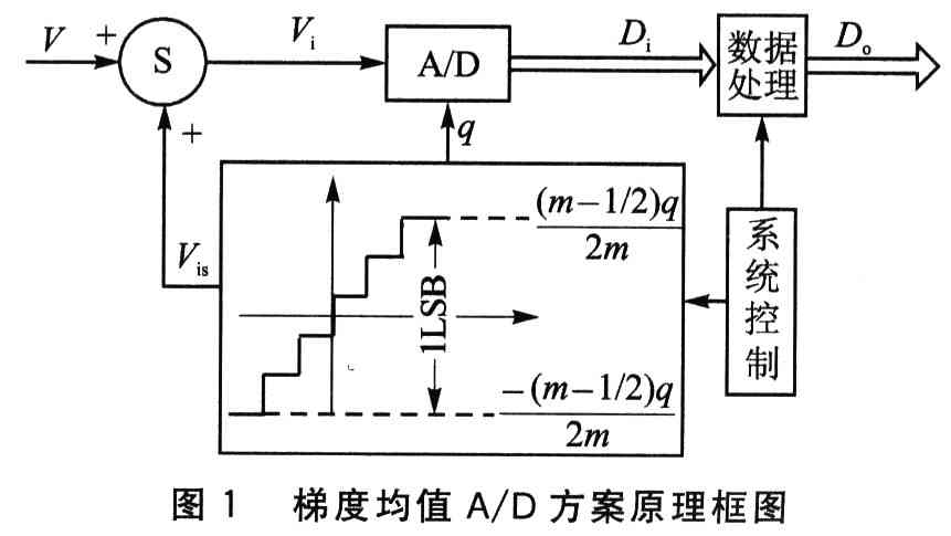 以等梯度递增,总幅度为1个量化单位q,其中m为正整数。该系统的输入信号V和阶梯波信号Vis依次叠加后送入基本量化系统,其量化输出信号Di输出到数据处理单元进行存储、处理。以基本量化系统的2m次Di的稳定量化输出的均值为系统输出,那么,有梯度均值A/D方案基本定理:设基本量化系统的量化单位为q,传递函数为