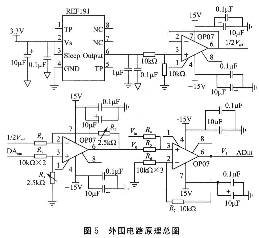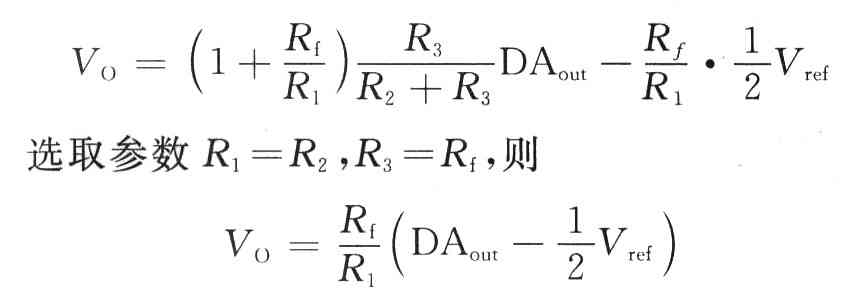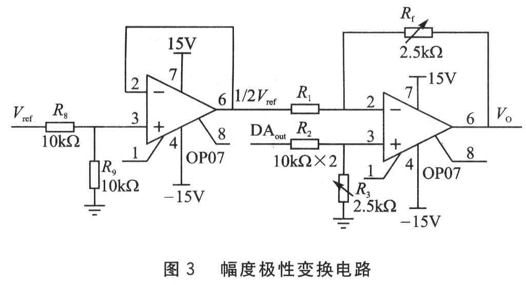 幅度极性变换电路要用到(1/2)Vref,所以要由基准电压源分压得到。为了防止电压被拉低,增加一个电压跟随电路,如图3左半部分所示。其中,参数选择R8=R9=10 kΩ,运放使用OP07。