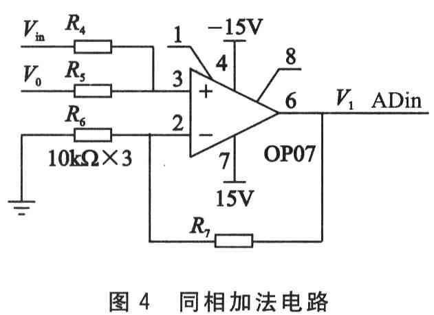 同相加法电路如图4所示。参数选择R4=R5=1ckΩ,R6=R7=10 kΩ,所以V1=Vin+V0,其中Vin为输入电压,V0为阶梯波电压,V1输入到ARM内部处理。