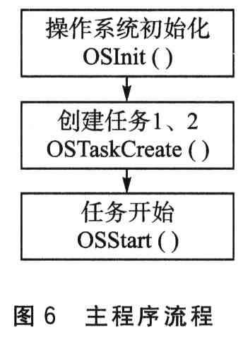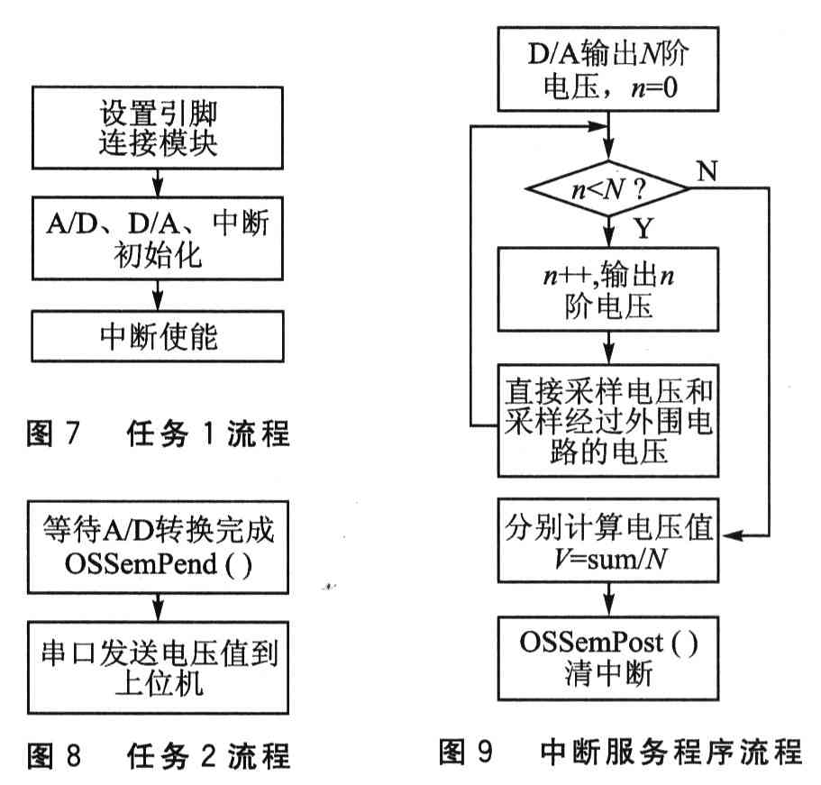 程序主要由以下几部分组成:主程序,负责初始化操作系统和创建任务;任务1,负责初始化目标板;任务2,负责目标板与上位机的串口通信;中断服务程序,负责采样和计算电压。各部分流程如图6~图9所示。