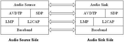 在娱乐消费市场中,A2DP实例化应用就是用音乐播放器把音频数据通过ACL连接发送到耳机或者音箱上。目前的框架规范中,并不支持同步的一点对多点的广播式音频分发,而对于点对点音频的分发,又存在着两种不同的角色,一个是信源设备(SRC),这种设备作为发起者将数字音频流发送到Piconet网中;另一个是信宿设备,是接收信源发出的音频流的设备。如果蓝牙音乐播放器是信源设备,那么与之交互的蓝牙耳机就是信宿设备,信源和信宿的区别就在于,它是发起者还是接收者。下面对该框架所涉及的具体协议和其依赖框架进行分析。