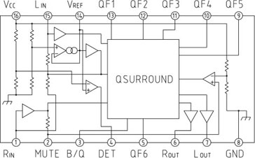 MM1454是三菱公司开发的Q Surround虚拟处理器IC,能够实现由Q SOUND Labs研制的音响算法。当左/右(L/R)两个通道中采用Dollby Pro逻辑编码的立体声信号输入到该芯片时,能产生一个背面的虚拟扬声器。这样仅仅使用左右两个扬声器,就可以逼真地再现3D音响。对于通常的立体声信号,MM1454使用Q Xpander技术,仍可以产生具有纵深感和宽范围的音响效果。由于采用了有源滤波器,MM1454仅需很少的外部元件,而且具有尺寸小、成本低的优点。