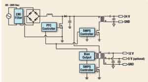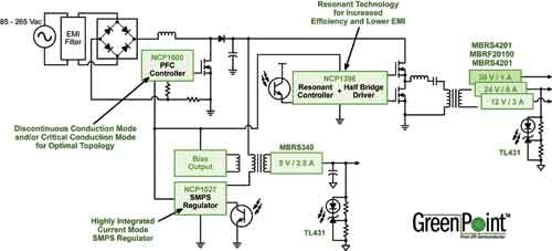 图3显示了基于半桥LLC结构的完整电源的示例。在这个示例中,HB-LLC级产生了多路输出。这种设计是安森美半导体公司所开发的一系列Greenpoint参考设计中的一部分,展示了高效率的电源拓扑。在这个示例中,对115或230V交流主电源而言,在90~220W的范围内,总体效率都大于88%。