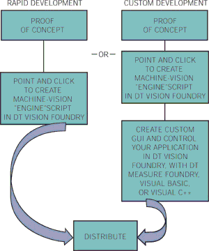 上述列表由于很具体,所以可能意味着你可以利用菜单驱动的基于图形的开发工具来创建机器视觉设备,而不是使用如C++这样的基于文本的语言来编写代码。尽管具有长期用基于文本的语言对机器视觉设备进行编程的开发者通常更愿意坚持使用他们多年来成功运用的工具,但你的确可以使用多种菜单驱动的图形化应用开发软件包之一。虽然业界中的一些人对这种不愿改变的倾向颇有微词,但要问一问自己,如果你聘请来处理某种设备的咨询专家第一次尝试使用新软件包来完成你的工作的话,你的感受如何呢?