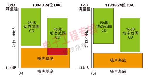 然而,对于大多数消费电子系统有很大的成本压力,使信号位于系统的噪声基底之外是实现高性能的关键。一个高性能的DAC(具有110dB以上的范围)对于所有用户都能提供高质量的听觉体验,而在保证听不出任何差别的前提下,对CD信号具有14dB以及更高的衰减空间。
