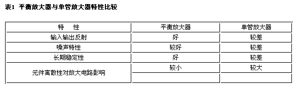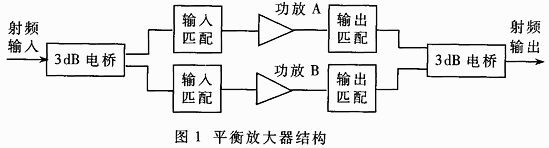 本文采用平衡放大器的形式,结构如图1所示。其工作原理与巴伦结构的电路相似,但是由于3dB电桥的应用,使得两路射频信号之间隔离较好,有利于两个端口的匹配。相对于单管放大器结构,其优点如表1。