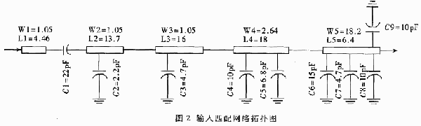 本文中的放大电路采用分离元件和分布参数元件混合使用的方法。由于电感比电容有更高的热损耗,所以在此类电路中通常避免使用电感,而使用高阻抗的传输线代替。混合类型的匹配网络通常包括几段串连的传输线以及间隔配置的并联电容。该放大器的输入匹配部分采用了四节连阻抗变换,输出匹配采用五节连阻抗变换的混合电路形式。输入、输出匹配网络拓扑图如图2、图3所示。