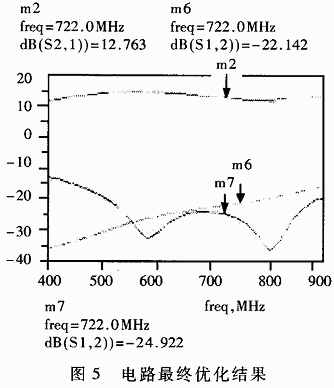 用ADS进行电路仿真并不能达到设计要求,需在此基础上进行电路优化。当只有小信号S参数作为模型来设计功率放大器时,电路优化的步骤一般为:首先尽可能以RL(相对最大输出功率的负载电阻)匹配为目标,优化和确定输出匹配电路元件值;然后再优化输入匹配电路的元件值,改善增益和输入匹配电路。需要注意的是:在优化前,必须得到尽可能完整的输出电路模型,然后在工作频率下对其优化,达到与RL的最佳匹配。图4为放大电路的仿真结果,图5为电路最终优化结果。