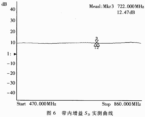 经过大量实验和反复调试,实测结果如图6所示。该驱动级放大器工作于线性状态。由图6增益曲线图可知,整个频带内增益平坦,为12dB左右,与仿真结果大致一样。回波损耗小于15dB,带内驻波比小于1.3。输入功率2瓦时,用功率计测得输出功率25W,信号幅度稳定,其交调抑制小于-35dB。各项指标满足系统要求,与国外同类数字电视发射机中放大器的指标接近,成本大大降低,为今后数字电视发射机的国产化研制奠定了基础。