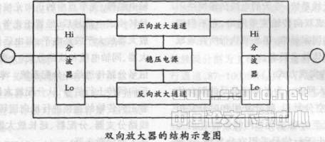 双向放大器总体上由正向放大通道、反向放大通道、分波器、混合器、稳压电源组成。