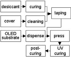 封装工艺之流程如图四所示,为了将Desiccant置於盖板及顺利将盖板与基板黏合,需在真空环境或将腔体充入不活泼气体下进行,例如氮气。值得注意的是,如何让盖板与基板这两部分工艺衔接更有效率、减少封装工艺成本以及减少封装时间以达最佳量产速率,已俨然成为封装工艺及设备技术发展的3大主要目标。