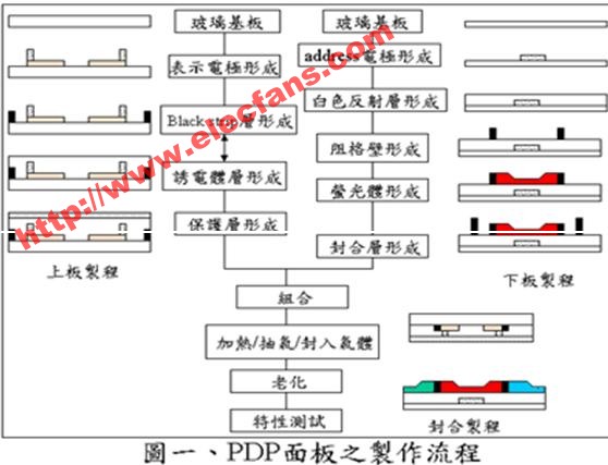 商品化的AC型PDP基本结构是由富士通公司在1996年所确立的,其基本制程可简单的分为上板制程与下板制程以及封合、组装制程(图一)。