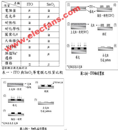 如图一所示,在上板制程中首先要在玻璃基板上制作透明电极。目前有两种;ITO或SnO2。ITO或SnO2在性质上有所差异(表一),ITO在耐热性与抗蚀性较差且成本较高,但透光率与导电性较佳。一般整面透明电极的制作是由玻璃厂商代工,若是ITO导电膜所采用的制程是以薄膜制程的物理溅镀法(sputtering)为主,然後以湿式蚀刻方式将ITO蚀刻成所需之透明电极图案(pattern)( 图二a)。而SnO2透明电极则因为是以CVD制程为主,其Pattern是以半导体lift-off的制程制作(图二b),需由面板厂商自行制造,这对面板厂商而言是多了一项制程反而会造成困扰。因此大多PDP面板制造商以购买ITO玻璃基板,再蚀刻ITO pattern为主。