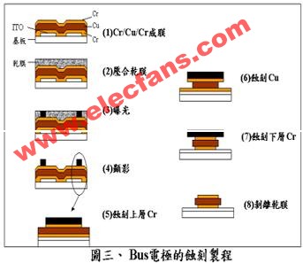 由於PDP面板在放电产生电浆时会有大量的热产生,造成透明电极的阻值变高,因而会影响气体放电的电压值。为了保持稳定的气体放电电压,特别在透明电极层上制作金属bus电极以增加导电度。此金属bus电极可视为辅助电极。在材料结构上有采用铬/铜/铬(Cr/Cu/Cr)的方式或是用银(Ag)电极。前者是以薄膜制程(溅镀法或电子束蒸镀法)在附有透明电极层基板上依次镀上三层金属,然後已湿式蚀刻制程依次将金属蚀刻以完成所需的图样(pattern)(图三)。而後者是以厚膜印刷的方式将银电极浆料(paste)透过有pattern的网版直接印刷在透明电极之上。除上述之两种方式以外,还有另外两种以湿式蚀刻制程为主。如杜邦公司开发一种称为Fodel之商品将银材料制作成带状之感光性乾膜(dry film),并利用压合机将乾膜压合在透明电极上,然後用黄光制程将其蚀刻成所需之pattern;另外一种是将银电极浆料制作成感光性的浆料,以印刷的方式将此材料整面印刷至附有透明电极的玻璃基板上面,然後在以黄光制程将其蚀刻成所需之pattern。