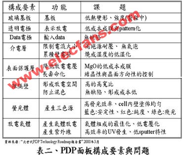 表二为PDP面板结构中的材料层与其特性之要求。由於目前PDP的各项制程与材料都还在不断地研发与改善,以期望能降低制作成本与良率,因此在此不作各项制程之详述。
