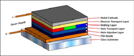其发光原理,系在透明阳极与金属阴极间蒸镀有机薄膜,注入电子与电洞,并利用其在有机薄膜间复合,将能量转成可见光。并且可搭配不同的有机材料,发出不同颜色的光,来达成全彩显示器的需求。