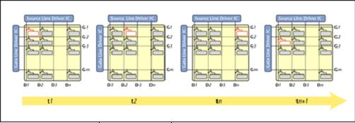 上图为各画素点指定的时间变化﹐由t1到tn闸极驱动IC持续选择开启G1﹐使得源极驱动IC以D1、D2到Dn的顺序对G1上的TFT画素充电。tn+1时﹐闸极驱动IC再度选择G2﹐源极驱动IC再D1开始依序选择。