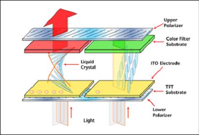 TFT-LCD 即是thin-film transistor liquid-crystal display的缩写.(薄膜晶体管液晶显示器)TFT-LCD如何点亮?简单说,TFT-LCD面板可视为两片玻璃基板中间夹着一层液晶,上层的玻璃基板是与彩色滤光片 (Color Filter)、而下层的玻璃则有晶体管镶嵌于上。当电流通过晶体管产生电场变化,造成液晶分子偏转,藉以改变光线的偏极性,再利用偏光片决定画素(Pixel)的明暗状态。此外,上层玻璃因与彩色滤光片贴合,形成每个画素(Pixel)各包含红蓝绿三颜色,这些发出红蓝绿色彩的画素便构成了面板上的影像画面。
