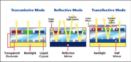 " 半穿透半反射式 " 为两者之折中﹐此装置以反射镜(half mirror)来取代反射板除了可以透过背光以外也可以利用外部光源的反射﹐以达到省电、提高亮度与减轻重量的效果。