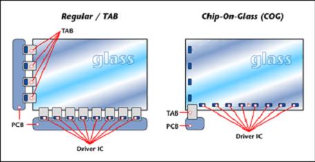 不同于传统制程﹕COG技术将驱动IC直接假设于玻璃基板上﹐此技术之优点包含有: