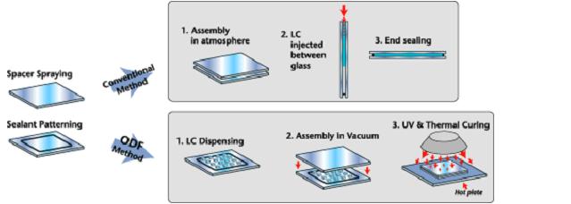4. 制造时间减缩: 由于省下的制程原本就是传统制程中最旷日费时的制程,而且随着面板的大型化趋势,或小Cell Gap的高质量面板,时间的耗费更久。通常Cell 制程在传统做法尚需至少三天方能完成,但对ODF制程而言,不到一天就可完成。