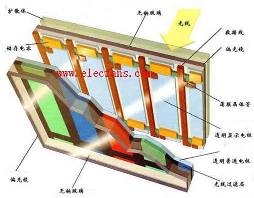 TFT LCD 的横截面很像是很多层三明治迭在一起。每面最外一层是透明的玻璃基体,玻璃基体中间就是薄膜晶体管 。 颜色过滤器和液晶层可以给显示出红、蓝和绿三种最基本的颜色。通常,LCD后面都有照明灯以显示画面。