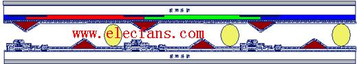 组合成的液晶盒结构可参见下图(这是我的毕业设计中MVA模式液晶盒结构图,TN模式液晶盒只是没有上下小凸起而已,其它的基本一样),也就是说,彩色滤色膜的R、G、B三基色按一定图案排列,并与TFT基板上的TFT子象素一一对应(注意:一个象素由三个子象素组成)。背光源发出的白光,经滤色膜后变成相应的R、G、B色光。通过TFT数组可以调节加在各个子象素上的电压值,从而改变各色光的透射强度。不同强度的RGB色光混合在一起,就实现了彩色显示。