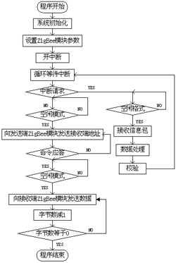 在系统软件设计时,节点采用串口通信模式,利用中断的方法完成数据的接收和发送。数据的传送采用主从节点方式,利用USB接口实现与PC通信。要发送的数据按照Zigbee协议规定的最大帧长度打包,加上网络层、媒质访问控制层和物理层的帧头,将数据通过SPI总线,按用户要求发送到接收端的射频收发模块。当从节点向主节点发送中断请求时,自动转入中断服务子程序实现接收信息包和数据处理。本系统数据的发送和接收流程如图5所示。