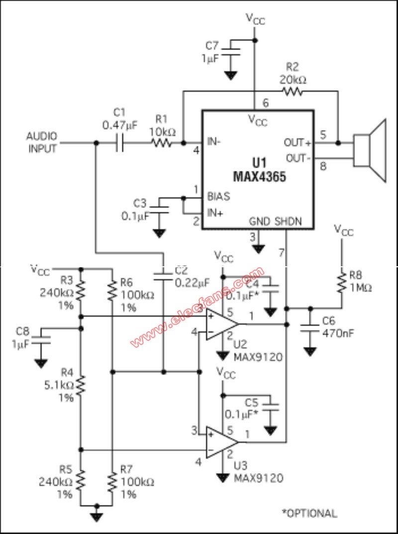 音频功率放大电路图由放大器MAX4365和MAX9120组成。
