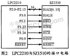 LPC2210可与SZ1510的HOST接口相连,并可通过HOST接口对SZ1510进行控制和设置。正常工作时,LPC2210把从HOST接口输出的MPEG-1格式视频流以文件形式送人电子盘进行存储。LPC2210与SZ1510的接口电路如图2所示。其中,HAD[0…15]接到ARM的P2.0~P2.15A作为16根数据线;P3.0接到HALE脚可实现SZ1510内部IOAR(I/O Address Registerl)和IODR(I/O DataRegister)寄存器的选择;P1.1和P3.27分别接读、写选通管脚HRD和HWR;通过将P3.24接到HCS可选通SZ1510;将P0.9接到HINT可发送SZ1510中断请求信号。