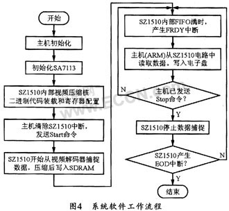 系统上电并启动后,ARM处理器首先通过SZ1510芯片的HOST接口对SZ1510内部寄存器进行配置,并通过I2C总线对视频解码器SAA7113H进行初始化。当设置好MPEG-1压缩格式及数据速率后,系统开始正常工作,并对输入的模拟视频信号经视频解码器进行解码和A/D转换,再将生成的CCIR-601数字视频流传人压缩编码芯片SZ1510进行处理,然后由SZ1510将数字视频数据转化为符合MPEG-1格式的影视文件,最后将MPEG-1数据流在ARM处理器的控制下通过IDE接口以文件形式写入电子硬盘进行存储。系统工作时,ARM还将不断监视相关信号,并在图像中加入相应的标志,直到接收到关机信号,系统自动结束压缩工作。