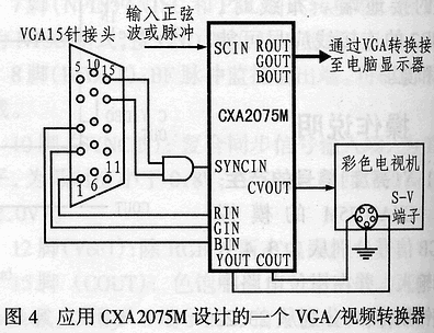 图4是应用CXA2075M设计的一个VGA/视频转换器,图中,左边的VGA15针接头可接在电脑主机显卡的VGA接口上,输出部分可以通过视频端口或S端子与电视机相连接,同时本转换器还可和电脑显示器进行接口以实现同步显示。