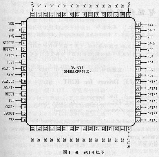 SC-691具有36脚裸片和64脚LQFP两种封装形式。图1是其LQFP封装的引脚排列图,各引脚的功能说明如表1所列。图2是其内部结构框图。