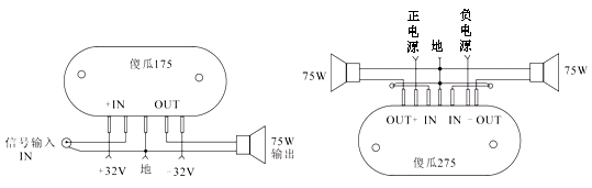 从表中参数可看出,它们都可以在电源电压变化一倍的情况下照常工作。加上散热片后可以有最大75W的输出。“傻瓜”功放的应用电路如附图1-26所示。图中给出了175功放,275功放两种应用电路。从图中可以看到,除了喇叭电源之外,不需要再接任何元器件,使用起来非常方便。