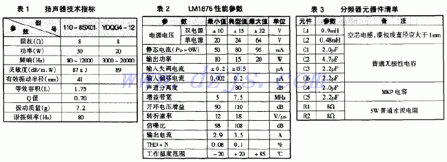 公司生产的银笛牌YDQG4-12型高音扬声器,该款扬声器采用了进口丝质振膜、磁液冷却系统、全封闭防磁式磁路等一系列Hi-Fi单元采用的技术,使它比常见的低价高音单元拥有更大的功率承受能力,音质更细腻柔美。低音扬声器则采用了南京电声股份公司生产的南鲸牌4英寸喷胶纸盆防磁低音扬声器,型号为110-8SX01。各扬声器技术指标如表1所示。