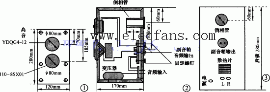 功放电路安装在右声道音箱中,因此左右两个音箱的后面板布局有较大的差异。倒相管长度以及主音箱侧面视图如图2所示。主音箱背面视图如图3所示。