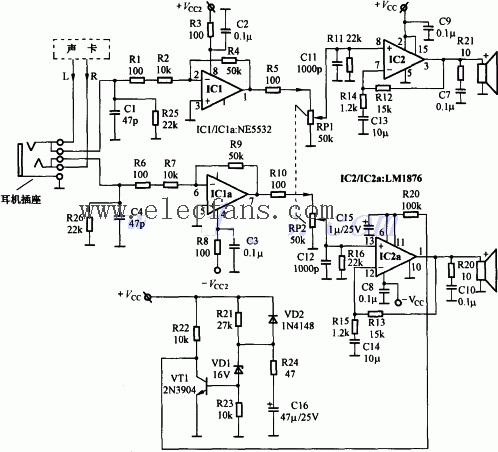 功率放大集成电路采用了NS公司生产的双声道20W高保真